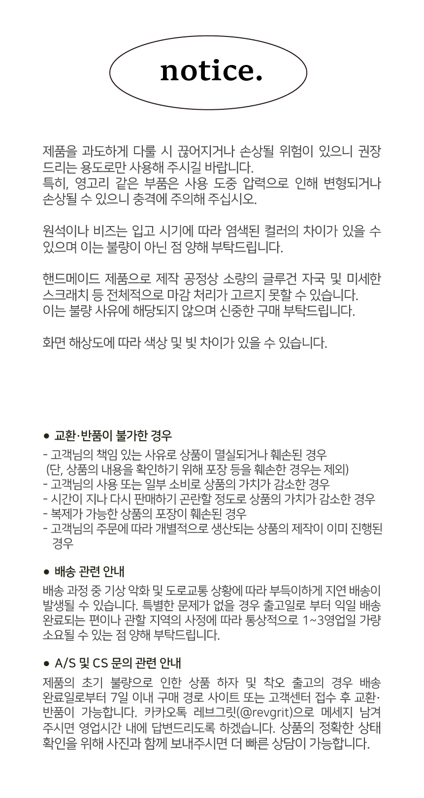 - 단순 변심의 경우 수령일로부터 7일 이내까지 교환∙반품이 가능합니다. (교환/반품비 고객님 부담)