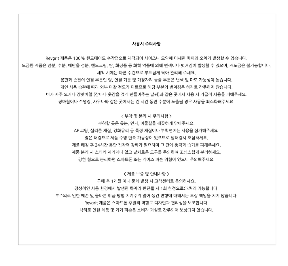 - 제품 특성상 단순 변심, 고객 부주의에 의한 제품 손상 및 파손(패키지 포함), 사용 및 개봉한 경우